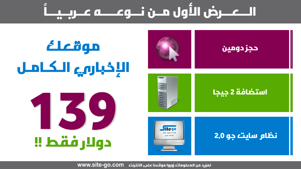 تقدم شركة نيربا عرض الموقع الاخباري الكامل لكافة عملائها الحاليين والجدد في الوطن العربي، ويتمييز هذا العرض بأنه الأول من نوعه وبهذه التكلفة المنافسة جداً. العرض يشمل العديد من الخدمات المميزة عالية الجودة وتتمثل بالتالي : 1- تسجيل نطاق الكتروني 2- استضافة 2 جيجا بايت وترافيك 20 جيجا بايت 3- نظام إدارة المحتوى سايت جو 2.0 4- دعم فني لمدة 60 يوم من تاريخ الشراء
