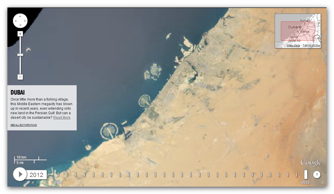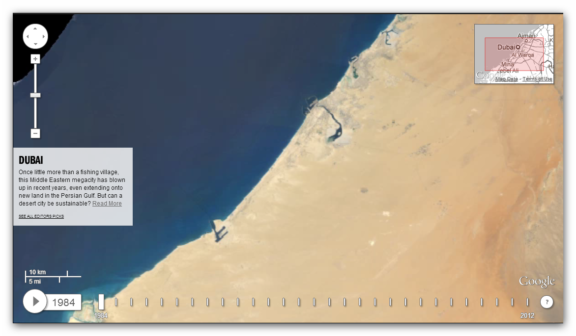 كشفت شركة "جوجل" الأميركية النقاب عن مشروع جديد يتيح للجميع الاطلاع على مدى التغير الذي طرأ على أجزاء محددة من سطح الكرة الأرضية منذ عام 1984 حتى العام 2012 ،أي على مدى 28 سنة. ويأتي "Timelapse" وهو الاسم الذي أطلقته الشركة على المشروع، ثمرة التعاون بينها وبين مركز المسح الجيولوجي الأمريكي USGS ووكالة الفضاء "ناسا" وصحيفة "التايم"، التي تعتبر هذا المشروع جزءًا من مشروعها الذي استنسخ الاسم منه. وهو عبارة تجميع للصور التي تم التقاطها على مدار أكثر من ربع قرن بواسطة الأقمار الصناعية، وثم تحويلها إلى خريطة تفاعلية تظهر مدى التغير الذي طرأ على بعض المناطق بحسب كل سنة من السنوات الثماني والعشرين الماضية. وفي هذا السياق، أعلنت جوجل أن مشروع Timelapse تم بناؤه بالاعتماد على ملايين الصور الفضائية وتريليونات البكسلات، كل ذلك لتمكن الجميع من استكشاف الكوكب. وضربت الشركة مثالًا على أنه كيف يمكن من خلال الصور الاطلاع على مراحل تغير إمارة "دبي"، وظهور البنيان والجزر الاصطناعية المحاذية لساحلها، بالإضافة إلى عملية إزالة الغابات التي تشهدها غابات الأمازون في البرازيل، وغيرهما. تجدر الإشارة إلى أن لجوجل مشاريع أخرى، كانت قد أطلقتها سابقًا، حيث قامت في شهر ديسمبر/كانون الأول من العام الماضي بإطلاق خريطة ليلية للعالم، حيث أظهرت الخريطة دول العالم ليلا مع تمركز للتجمعات البشرية التي تدل عليها الأضواء التي تصدر عنها.
