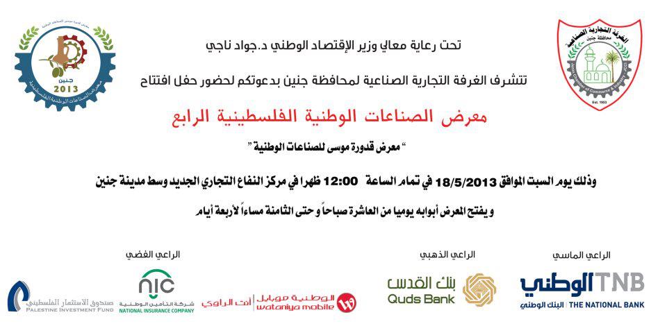 تشارك '>#ffffff]تشارك نيربا للانتاج الجرافيكي في معرض الصناعات الوطنية المقام على أرض جنين في الفترة ما بين 18-5-2013 وحتى 21-5-2013 حيث ستقوم الشركة بعرض العديد من منتجاتها الرئيسية في المعرض