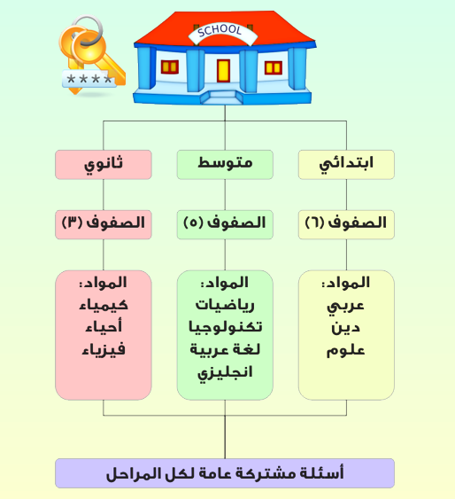 المثال هنا هو لمدرسة تحتوي على مراحل مختلفة (ابتدائي، ثانوي، متوسط) وكل مرحلة لها مواد وعدد صفوف يختلف عن المرحلة الأخرى كما في الصورة